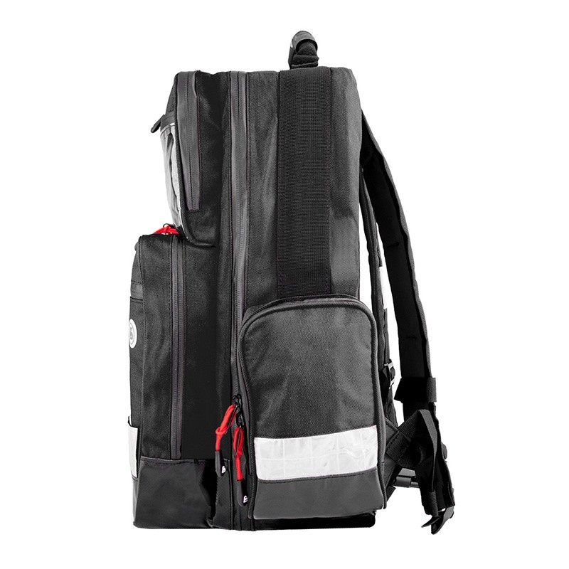 Viele externe Taschen (zwei Seiten- und eine Vordertasche, passend z.B. für einen AED), eine intelligente Inneneinteilung mit fünf separaten Modultaschen und Gummilaschen (z.B. zur Befestigung von Guedeltuben o. ä.), sowie ein graues Innenfutter, welches zur besseren Erkennung des Rucksack-Inhalts beiträgt, runden den Nutzenumfang für den Anwender ab.