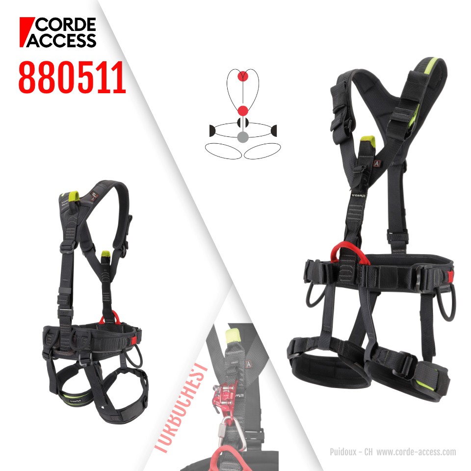 La partie inférieure est conçue pour garantir la meilleure combinaison entre confort en suspension et liberté de marche, tandis que le rembourrage de la partie poitrine offre un excellent confort au niveau du cou. La sangle ventrale est équipée d'une grande boucle qui permet l'insertion d'un maillon rapide ou d'un anneau ouvrable pour la connexion du bloqueur ventral Turbochest, qui peut être tendu à l'aide de la sangle dédiée. 6 points d'attache textiles : ventral pour la suspension, sternal et dorsal pour l'antichute, deux latéraux et un arrière pour le maintien au travail et la retenue. 4 porte-matériels et 2 emplacements pour mousqueton Kilo. Velcro pour fixation du logo de l'organisation et du nom d'utilisateur sur les deux tours de cuisse. Equipé d'une puce NFC TRACK pour l'identification numérique. 2 tailles.
